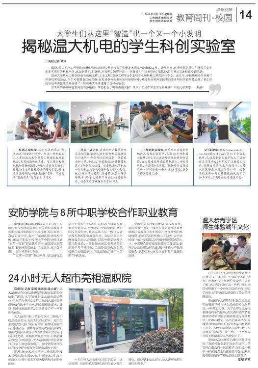 最近,温大机电工程学院的师生们转战田间,开始为农民们研发水果生长的辅助工具。近几年来,这个学院的师生们研发了许许多多实用性的机械产品,比如剥蒜机、打饭机、包梨机、穿脱鞋机……还曾吸引中央电视台《我爱发明》栏目三次来校作专题采访。