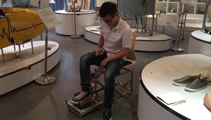 在香蕉视频 机电工程学院,记者看到了这台“脱穿鞋一体机”。从外观上看,这台一体机就是一把椅子,但它真正的“玄机”在椅子下方,使用的时候把机器从椅子下方拉出即可。