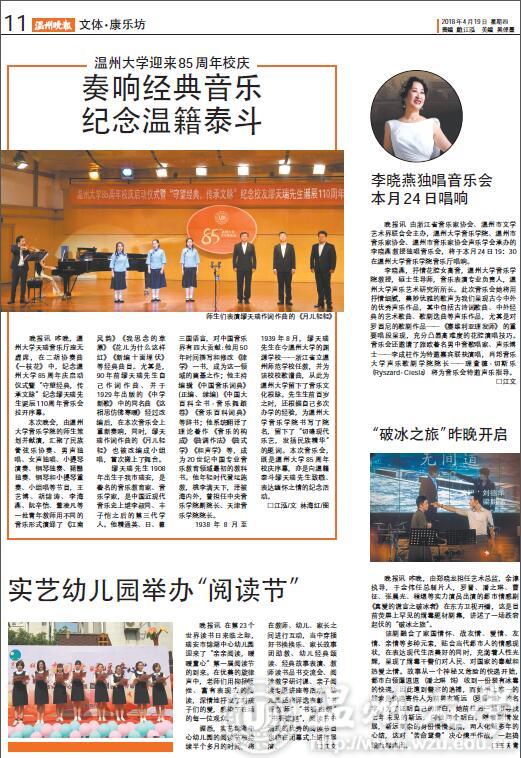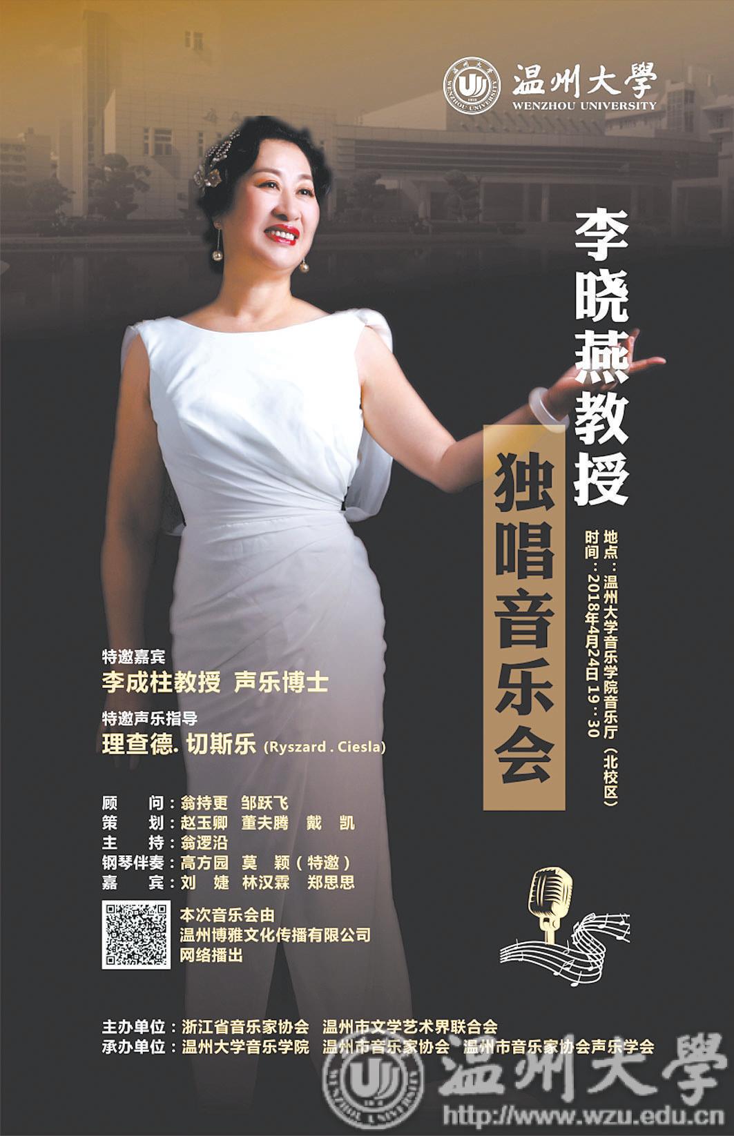 晚报讯 由浙江省音乐家协会、温州市文学 艺术界联合会主办,香蕉视频 音乐学院、温州市 音乐家协会、温州市音乐家协会声乐学会承办的 李晓燕教授独唱音乐会,将于本月24日19:30 在香蕉视频 音乐学院音乐厅唱响。 李晓燕,抒情花腔女高音,香蕉视频 音乐学 院教授,硕士生导师,音乐表演专业负责人,温 州大学声乐艺术研究所所长。此次音乐会她将用 抒情细腻,美妙优雅的歌声为我们呈现古今中外 的优秀声乐作品,其中包括古诗词歌曲、中外经 典的艺术歌曲、歌剧选曲等声乐作品,尤其是对 罗西尼的歌剧作品——《塞维利亚理发师》 的重 要唱段呈现,充分凸显高难度的花腔演唱技巧。 音乐会还邀请了旅欧著名男中音歌唱家、声乐博 士——李成柱作为特邀嘉宾联袂演唱,肖邦音乐 大学声乐歌剧学院院长——理查德·切斯乐 (Ryszard·Ciesla) 将为音乐会特邀声乐指导。