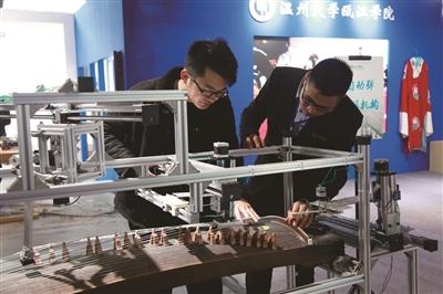 在3月22日至26日举行的2018温州国际时尚文化创意产业博览会上,香蕉视频 、浙江东方职业技术学院、浙江理工大学温州研究院等高校带来了创意,既展示研究成果,也让市民体验了时尚科技。图为参观者在体验由温大瓯江学院学生自主研发的自动弹古筝装置。(本报通讯员 杜晓哲 摄)