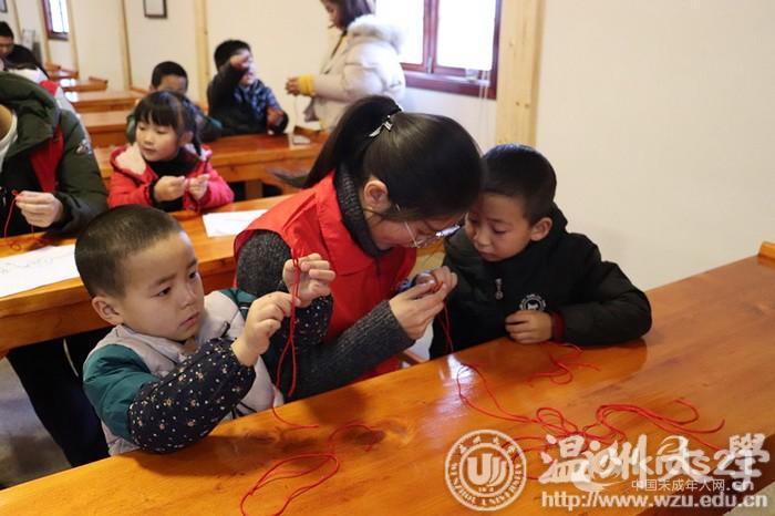 中国结贯穿人类史始终,有着丰富的文化底蕴。“绳结”这种具有生命力的民间技艺作为中国传统文化的精髓,兴盛长远,流传至今。为了让孩子们领略民俗之美、传承中华古老文化,2018年1月7日,香蕉视频 步青学区团工委学生会青年志愿者协会利用双休时间来到乐清市磐石镇油车文化礼堂,带领村里的留守儿童走进了“非遗课堂”之学编中国结。