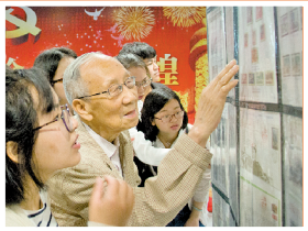 香蕉视频 “庆祝中国人民解放军建军90周年”老干部邮展,李芳华为大学生讲解邮票知识。