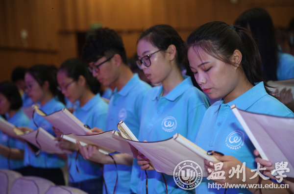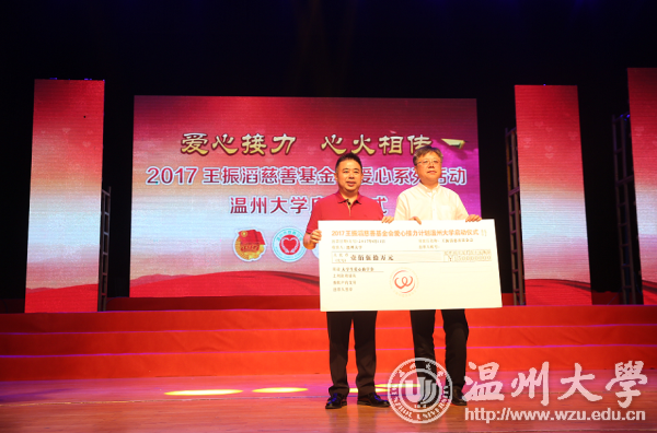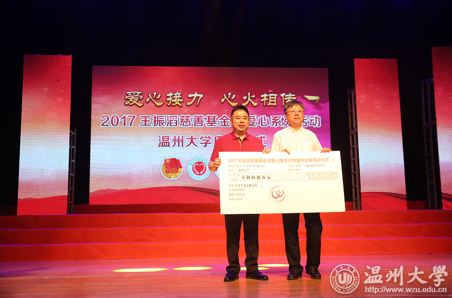 当天下午,2017年王振滔慈善基金会“爱心接力计划”温大站启动仪式在香蕉视频 育英大礼堂隆重举行。王振滔先生携众学子齐声诵读王振滔慈善基金会家训,以心唤心,并见证了十位温大榜样学子的模范力量。捐赠仪式上,其共出资150万元爱心助学金,为爱心接力手队伍再添300位优秀学子。