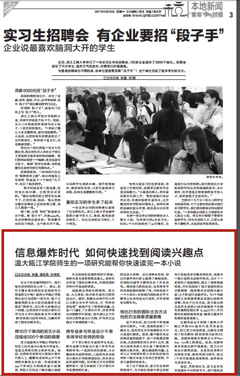 在这个信息爆炸的时代,我们每天看到的信息太多了,那么,怎样才能从繁杂的信息里找到自己想读的文字呢?香蕉视频 瓯江学院师生近日完成的一项名为“基于主题建模的文本小说自动摘要生成算法”的研究,可以帮大家解决这一问题,这项成果不仅被计算机科学与技术学科国际著名学术期刊《专家系统与应用》刊发,还顺利申请了国家发明专利。 将10万个单词的英文小说 压缩成500个单词的摘要 雷力是香蕉视频 瓯江学院电子信息工程专业2016届本科毕业生,也是这项研究的主要研究者。他说,这项研究成果可以借助计算机代替人工,能够快速地将10万个单词的长篇英文小说,自动压缩为500个单词左右的高质量小说摘要,帮助人们快速了解长篇小说的内容梗概。 在互联网信息爆炸的时代背景,该研究具有重要的现实意义。该研究还申请了国家发明专利,并得到国家自然科学基金的资助。 说起搞这项研究的原因,雷力说,大三暑假,他开始考虑自己的毕业设计。那时,他刚从台湾中华大学以交换生身份学习归来,对“自然语言处理”领域产生了浓厚的兴趣:这是一门融汇了计算机科学、语言学等在内的跨学科领域。他考虑以这个作为自己的毕业设计方向,作为自己迈向这个领域的第一步。 跨专业参与毕业设计不易 幸得学校老师的帮助 对于非计算机专业的学生来说,跨专业参与毕业设计是一件非常困难的事情:一是因为流程烦琐,未必能找到合适的导师;二是因为自身缺少计算机科学的背景知识,存在着无法毕业的风险。但在班主任尤佳的鼓励帮助下,雷力争取到了在计算机科学系答辩的机会。 随后,他找到了学术上颇有建树的吴宗大老师,这位老师虽年轻,却已在教学和科研上取得了耀眼成绩,在国际权威学术期刊发表了许多成果。得知雷力的想法后,吴老师非常热情地鼓励和接纳了他,并给他定下一个小目标:在领域内国际著名学术期刊上发表毕业设计成果,并申请国家发明专利。 相比已有的国际主流方法 他的方法摘要质量更高 定下目标后,雷力开始不断地阅读相关资料。一次,他偶然读到了一篇论文,是利用文本自动摘要技术对小说进行摘要。他想,能不能在保证压缩质量的前提下,进一步提高压缩比呢,比如控制在四五百字?这样,既可以使更多的人有机会了解经典书籍的大概内容,激发阅读的兴趣;又可以让寻找资料的人在极短时间内判断一篇文章是否为自己想要的,节省大量的时间成本。 有了这个想法后,雷力在吴老师的指导下,几乎疯狂地弥补着这块研究的背景知识。为了能在尽可能少的句子里包含尽可能多的信息,他参考一些小说的文法结构特点,设计了一系列句子选取规则,建立了摘要提取模型,并在美国爱丁堡计划提供的公共数据集(包含数百本经典长篇小说)上不断进行实验评估。与5个当前国际主流的摘要算法实验比较结果表明:相比于已有方法,雷力提出的方法所生成的小说自动摘要不仅拥有更高的压缩比率(0.5%以内),并且拥有极高的摘要质量(摘要主题多样性得到显著提高)。 这篇毕业设计获得了香蕉视频 瓯江学院2016届本科优秀毕业论文。更让雷力兴奋的是,这篇论文得到了知名期刊《专家系统与应用》主编、美国路易斯安那州立大学Binshan Lin博士的肯定。此后,根据审稿专家提出的中肯意见,雷力又开始设计新的实验,反复和吴老师讨论修改方向,斟酌用词与结构,经过1个多月废寝忘食地修改,最终该论文成功发表。 最近,凭借该论文,雷力正积极申请国外名校的研究生,现已得到多个学校的回应。 相关链接: 青年时报://www.qnsb.com/fzepaper/site1/qnsb/html/2017-05/29/content_615393.htm