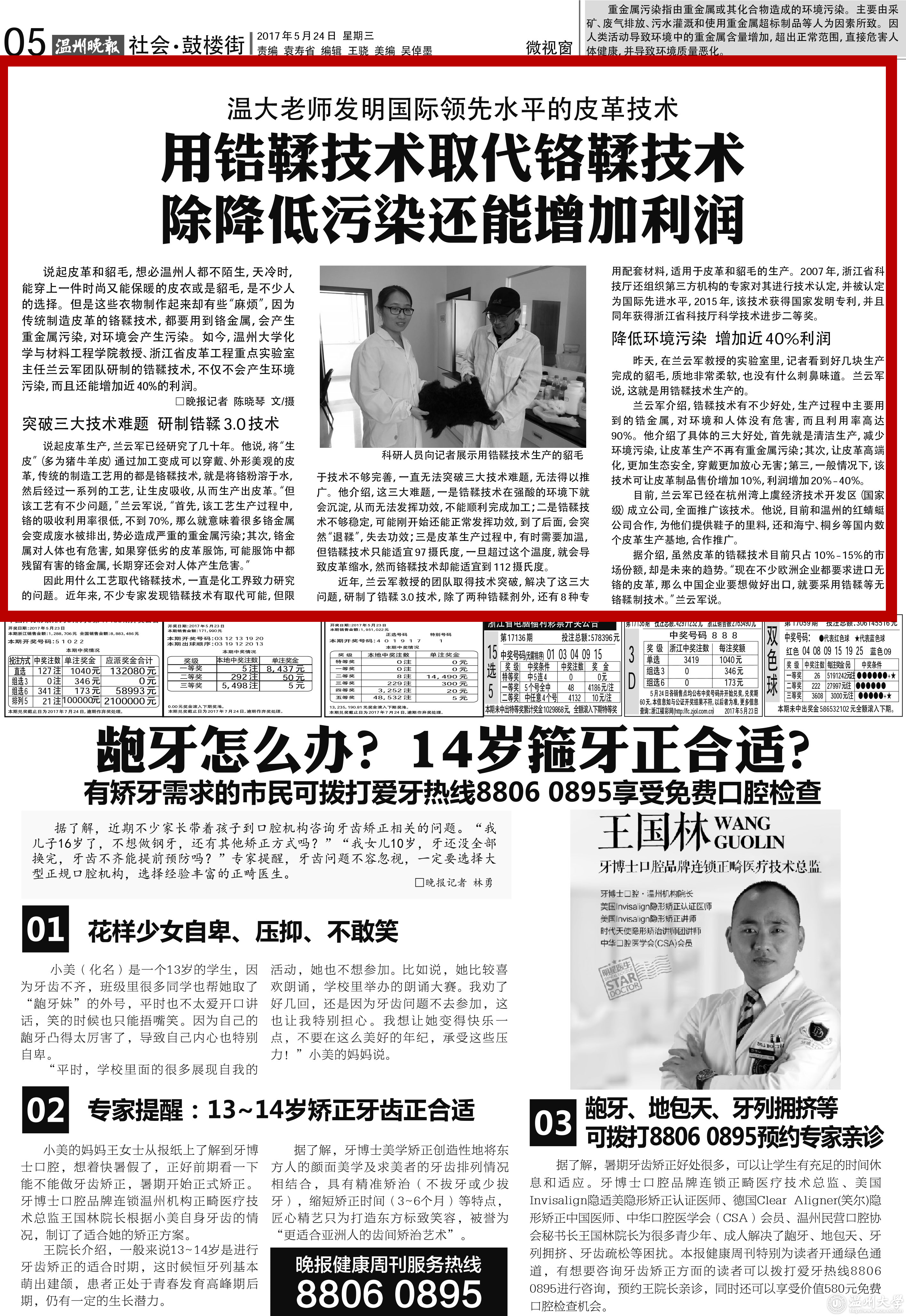 说起皮革和貂毛,想必温州人都不陌生,天冷时,能穿上一件时尚又能保暖的皮衣或是貂毛,是不少人的选择。但是这些衣物制作起来却有些“麻烦”,因为传统制造皮革的铬鞣技术,都要用到铬金属,会产生重金属污染,对环境会产生污染。如今,香蕉视频 化学与材料工程学院教授、浙江省皮革工程重点实验室主任兰云军团队研制的锆鞣技术,不仅不会产生环境污染,而且还能增加近40%的利润。