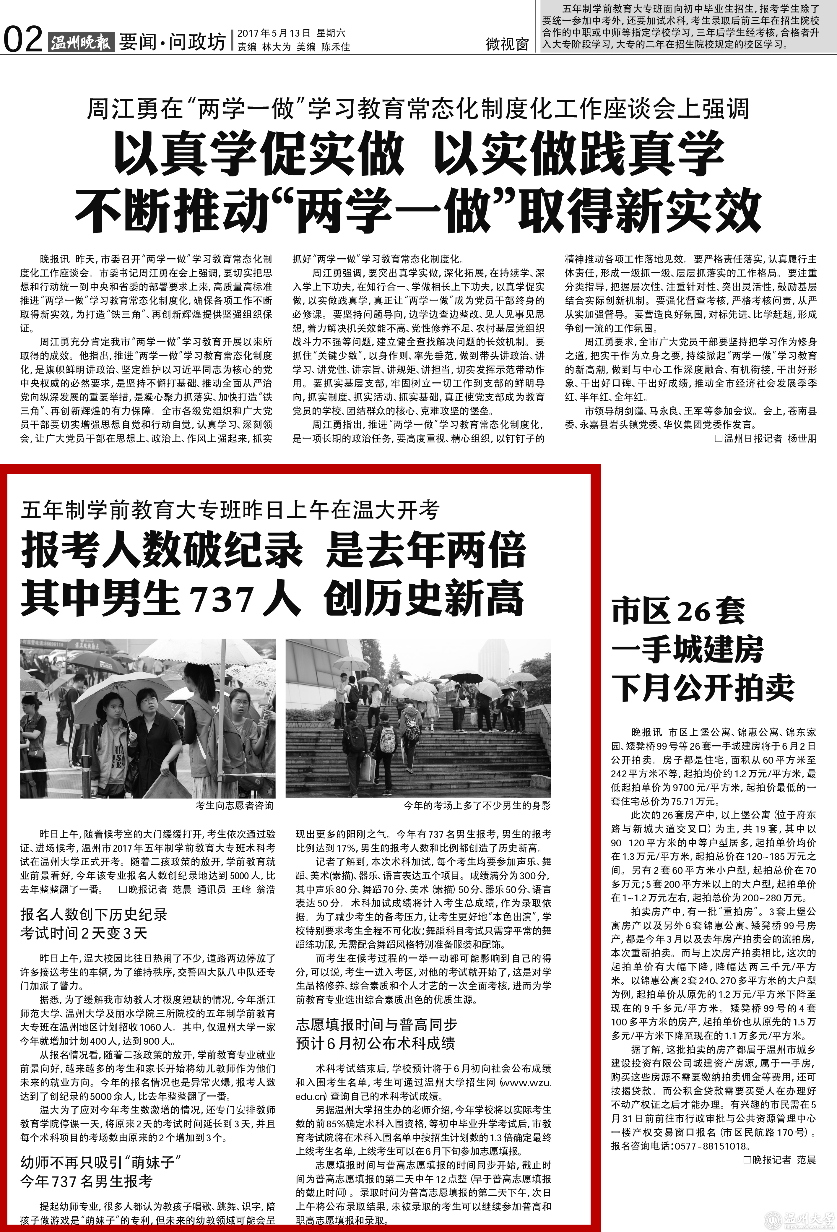 温大为了应对今年考生数激增的情况,还专门安排教师教育学院停课一天,将原来2天的考试时间延长到3天,并且每个术科项目的考场数由原来的2个增加到3个。