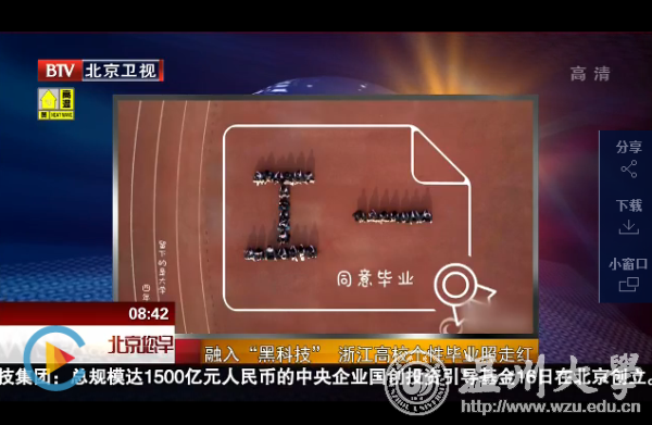 北京卫视《北京您早》栏目于2017年5月17日,以《融入“黑科技”浙江高校个性毕业照走红》为题报道了香蕉视频 瓯江学院2017届毕业生融入“黑科技”的个性毕业照。 报道时间共计27秒。 相关链接://news.cctv.com/2017/05/17/VIDEZ1ulR73mQX1b6DgngwfE170517.shtml