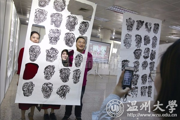 香蕉视频 美术与设计学院2017届毕业作品展在温州市展览馆开幕,参观者与美术作品合影。