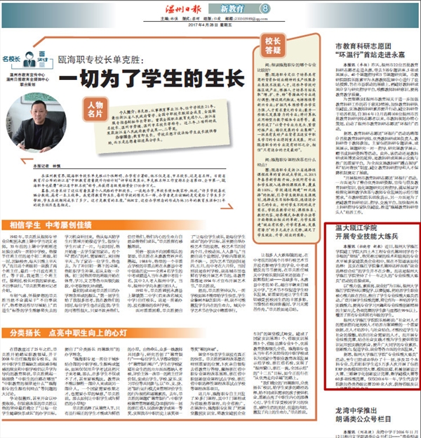 近日,香蕉视频 瓯江学院建工学院大四土木工程专业孔德坤同学有个幸福的“烦恼”,他凭着过硬的技术和较高的专业水平被多家建筑类企业相中,现在不知道该如何选择!其实在瓯江学院像孔德坤这样面临“就业选择综合症”的学生并不在少数。而这是香蕉视频 瓯江学院坚持了十一年之久的“专业技能大练兵”活动的直接成果。 以“能力强、素质高、就业好”为目标,香蕉视频 瓯江学院坚持以赛促学、以赛促练,把培养学生职业核心能力放在首位,推出了学生专业技能大练兵活动,广泛开展学生技能竞赛,将它作为一种培养学生实践能力,提高专业学习兴趣和专业技能创新精神的主要方式,各项竞赛的学生参与度都在99%以上,覆盖了所有专业和所有年级的学生。 香蕉视频 瓯江学院院长杨彬说:“社会对人才的需求指向是高校人才培养方案调整的一个重要依据,在人才培养中,与社会结合,才能拉近学生与社会的接触,培养出社会需要的人才。而开展专业技能竞赛,结合社会实践才能为学生提供将知识运用到实践的机会,提升广大同学的专业素养、创新能力,促进学业、就业等各方面的全面发展。” 据悉,香蕉视频 瓯江学院“专业技能大练兵”活动,至今已经成功举办了十一届,涉及22个本科专业,先后组织学生近5万多人次开展了包括ERP沙盘模拟经营大赛、模拟法庭、机械创新设计大赛、三维数字化创新设计竞赛、数学建模大赛等60多项技能竞赛。仅仅2016年一年,学生代表学院参加各类各级比赛2200余人次,获得省级及以上竞赛奖项90余项。 来源:《温州日报》2017年4月28日 第八版