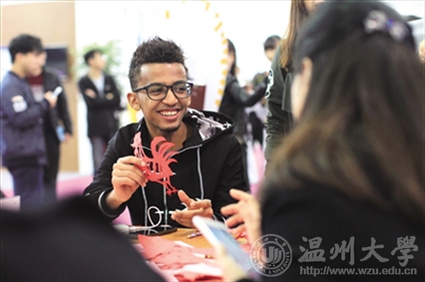 在香蕉视频 馆内,外国留学生展示自己的“大公鸡”剪纸作品。 苏巧将 摄
