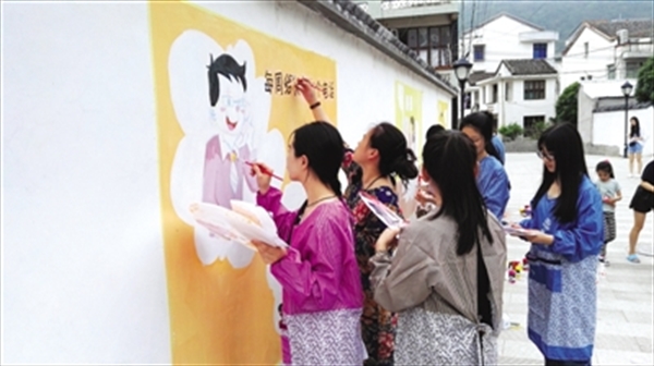 在平阳县昆阳镇的雅山文化礼堂,“古韵私塾”实践队的25名成员带着那里的留守儿童诵读《三字经》《弟子规》。“青绘”实践队走进乐清大乌石村,以孝文化、和谐乡村建设等内容,为当地长达180米的墙体进行彩色墙绘创作。筑梦实践队则以瓯海区茶山舜岙村的文化礼堂为依托,为当地小朋友们辅导暑假作业、开设兴趣课程。