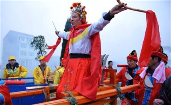 就杨府爷信仰而言,划太平龙与划龙船的最大共同点,是二者都要“点殇”和“送殇”,各地亲戚、宗族都要放帖“摆香案”请龙。在划太平龙的参龙词里,有“鸣锣击鼓闹洋洋,总管出令点神殇,点起神殇三十六,家家户户保吉祥”的词句。所谓“殇”,是指青壮年非正常死亡者,“神殇”是指某一神灵体系里强死而为神的部属。并非所有的地方神都有这样的部属,在苍南的民间道教科仪里,杨府爷和陈靖姑有这样的部属神殇,而以杨府爷的部属神殇交代得最具体清楚,并且成为龙船划手中的“阴兵”。龙船有36位划手,要点36位神殇。点神殇的仪式在划太平龙里由参龙师来做,在划龙船时由道士来完成。参龙师相对于道士是没有立堂号、授箓、领度牒的半职业化神媒,他们都在祠鼓的击打声中达到通神的目的。
