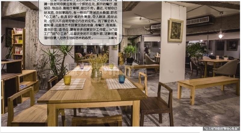 在温州新城黎明工业区的黎明92文化创意园,每隔一段时间你就会发现一个新的去处,新开的餐厅、服装店、饰品店、咖啡厅等等,层出不穷。最近,可能你已经发现,在创意园内,有一栋旧厂房被改头换面,取名“心工场”。极具设计感的外墙面,夺人眼球,路经此处,会引人不由地好奇它内在的玄机。而了解它的人都知道,这里是艺术创意生活的地盘,有餐厅、有画展、音乐沙龙、读书会,更有许多创意设计工作室。从“旧工厂”到“心工场”,这里改变的不只是外观,还寄托着温州创意人对待生活和艺术的态度。王婷/文