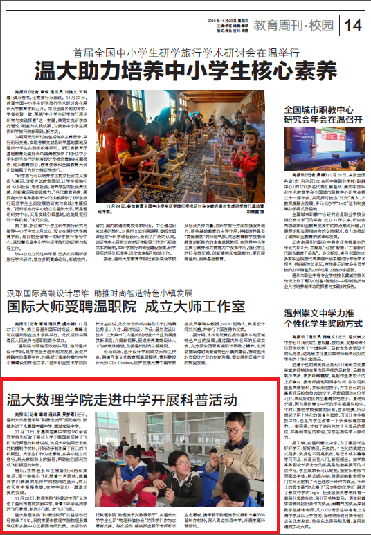 商报讯(记者章瑚 通讯员吴梦柔)近日,香蕉视频 数理学院“科普进校园”活动启动,陆续走进了永嘉巽宅镇中学、鹿城实验中学。