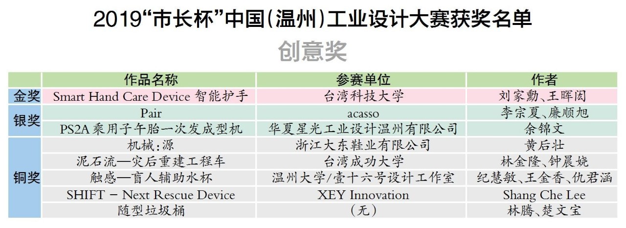 11月26日上午,2019“市长杯”中国(温州)工业设计大赛颁奖典礼在温州国际会展中心6号馆举行。来自台湾科技大学劉家勳、王暉閎的设计作品《Smart Hand Care Device 智能护手》获得创意奖金奖;来自浙江豪中豪健康产品有限公司周国海的设计作品《AI智能太空按摩椅》获得产品奖金奖。
