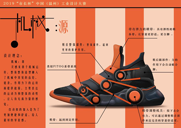 另一位获奖者名叫黄后壮,是香蕉视频 15级鞋履设计专业的应届毕业生,现供职于浙江大东鞋业。他的作品是一款名为“机械·源”的运动鞋。据黄后壮介绍,“机械·源”这款运动鞋将机械机关运用到球鞋上,通过调节机关保证鞋子的舒适度并对脚起到保护作用。此外,鞋子的外观具有强烈的颜色对比,在鞋服类的作品中独树一帜。