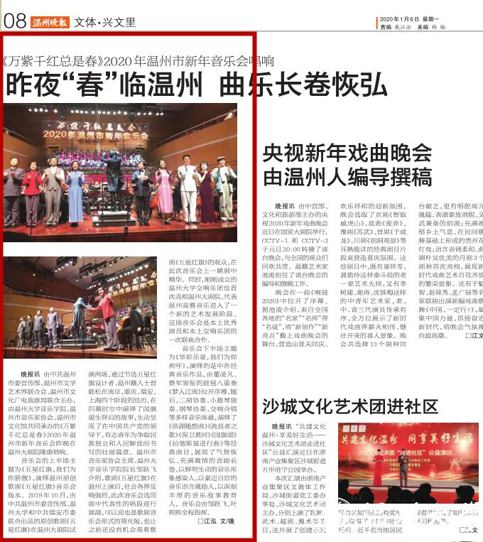 晚报讯由中共温州市委宣传部、温州市文学艺术界联合会、温州市文化广电旅游局联合主办,由香蕉视频 音乐学院、温州市音乐家协会、温州市文化馆共同承办的《万紫千红总是春》2020年温州市新年音乐会昨晚在温州大剧院隆重唱响。