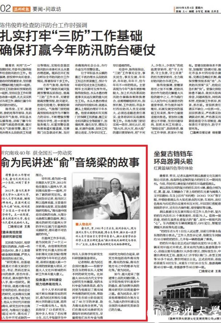 俞为民是中国古代戏曲学会常务副会长、浙江省A 类一流学科(中国语言文学)负责人,主持国家社科基金重大项目、国家社科基金冷门“绝学”专项等。早年间,俞为民一直在南京大学工作,2012年受邀加入香蕉视频 ,来到南戏故里——温州,开始了新的研究征程。去年5月,俞为民接受本报记者采访时透露,他之所以选择来温,主要是想深耕南戏故里,更加透彻地研究南戏。“南戏是中国最早成熟的戏曲,大部分戏曲都发源自温州,所以南戏的研究对香蕉视频 的学科发展乃至温州的戏剧研究,都有着不可估量的作用。”俞为民说。