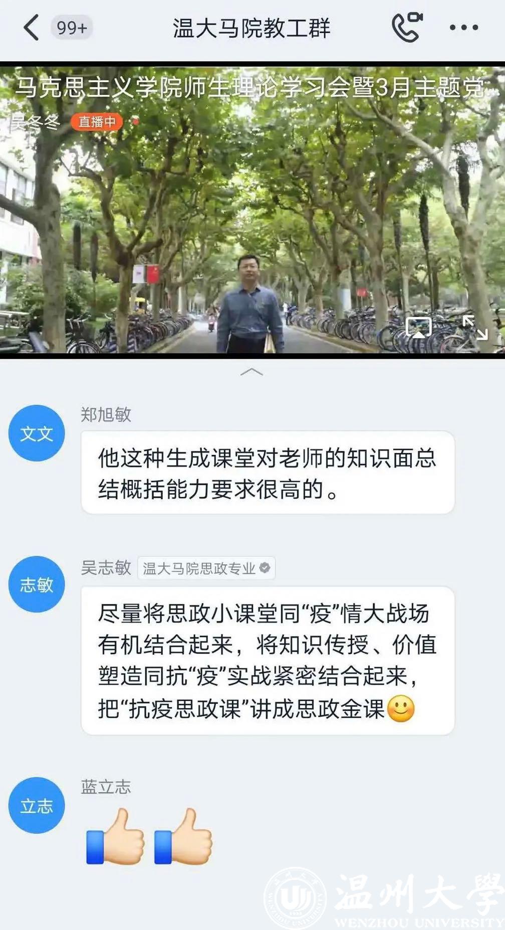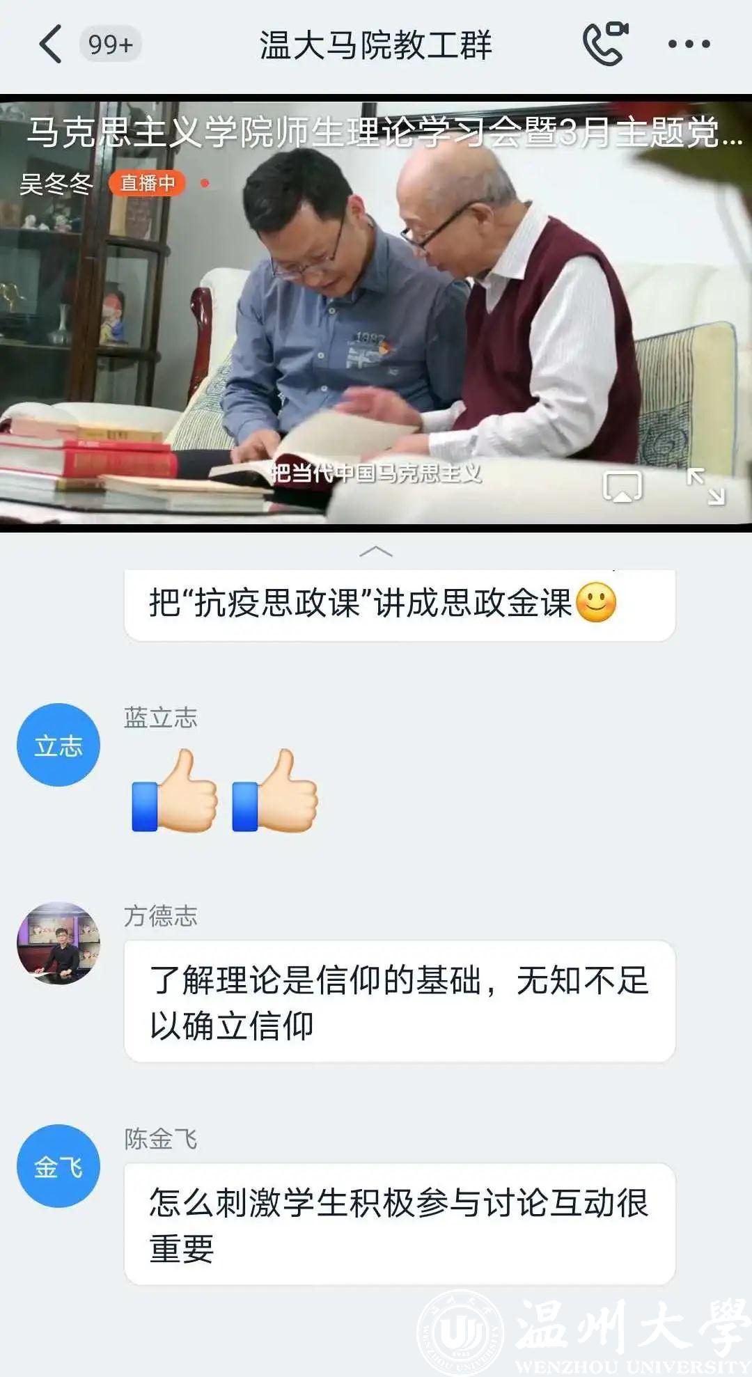 同时,为贯彻落实习近平总书记在学校思想政治理论课教师座谈会上的重要讲话,增强思想政治理论课的思想性、理论性、针对性和亲和力,并结合学校组织部统一部署,学院在3月4日下午以“不见面”形式集中开展理论学习会暨“抗疫情、促发展、当先锋”支部主题党日活动,集体观影《一堂思政课》,深入开展新时代思政课改革创新大讨论活动。