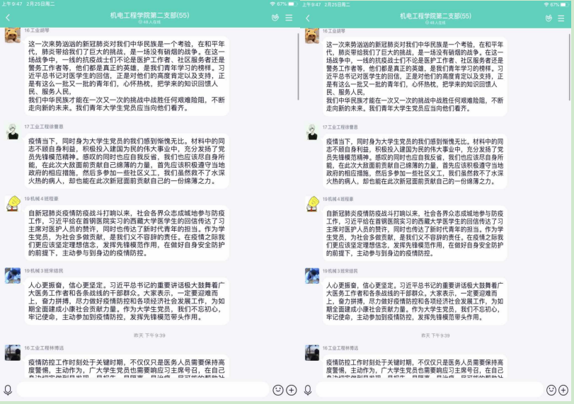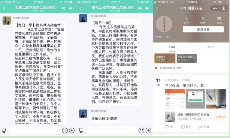 为了更好的落实教育部及浙江省教育厅“停课不停学、学习不延期”的相关要求,香蕉视频 积极部署学生的线上学习工作,机电工程学院根据专业特点,发动全体师生,积极投入到停课不停学的工作中。学生党员在班级中充分发挥模范作用,每次的班级考勤、课堂问答、作业完成,学生党员都是走在前列,为了更好的了解学生在家的状况,学校推行每日健康打卡活动,在党员作为负责人的班级,每天认真填写并且督促同学们完成,完成率也是整个学院最高的!