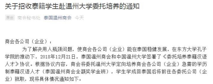泰国籍学生来香蕉视频 学习汉语和商务知识,学成回泰国后可前往当地温商企业任职……4月1日,记者获悉,香蕉视频 与泰国温州商会“联姻”,创办了泰国温州商会全额奖学金班,首期计划招录15人,将于今年9月开班。