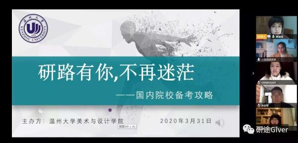 疫情不是暂停键,成长指导全在线。一个多月时间以来虽然“开学不返校”,但是245名本科毕业生的就业工作一直让香蕉视频 美术与设计学院的老师们牵挂不已,尤其是对于学院立志考研和准备出国的学生,如何帮助他们顺利实现梦想?为了更好地指导学生学习规划和考研升学,近日,香蕉视频 美术与设计学院在“云端”组建了一个实力不容小觑的导师团,聘请8位优秀校友担任“考研(留学)校友学长导师”,并且连续举办了2场“云”端传送考研(留学)真“经”的活动,参加学生近200人次。