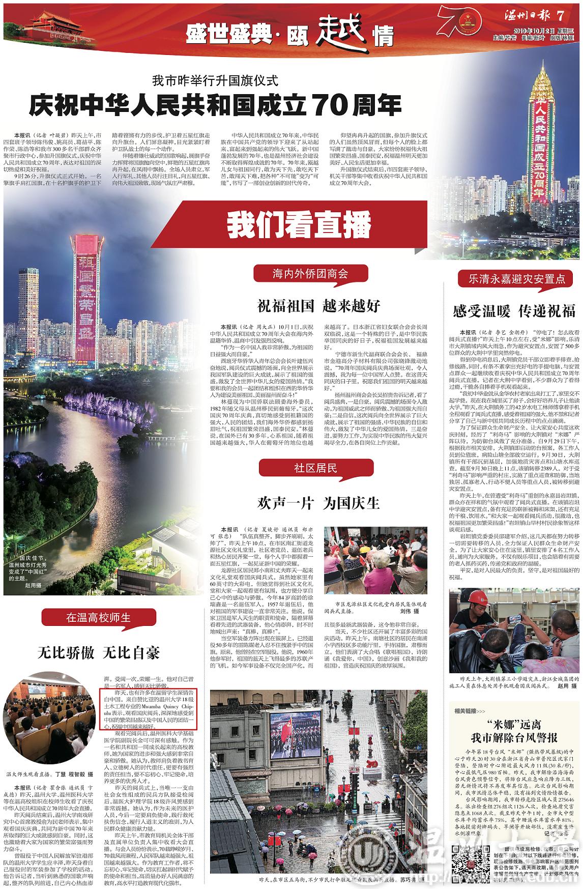 10月1日,也有许多在温留学生深情告白中国。来自赞比亚的香蕉视频 18级土木工程专业的Mwamba Quincy Chipulu 表示,观看国庆阅兵,深深地感受到中国的繁荣昌盛以及中国人民的团结一心,祝福中国越来越好。