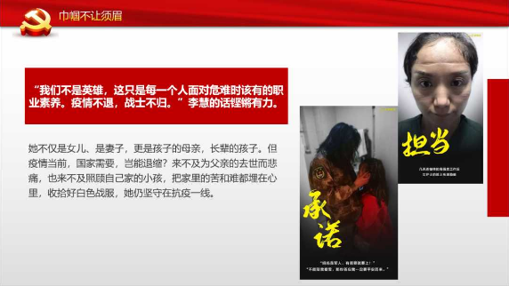 来自研究生第三党支部的正式党员王景欣以“使命扛在肩,带头冲上前”为题讲述了一个个动人的抗疫故事。从逆行者钟南山院士到“冲锋医生”张文宏,再到“最美医生”李慧,他们无不用自己的方式抒写着自己的责任担当。王景欣同志也以自己的抗疫经历体悟着自身使命,令全场观众动容。