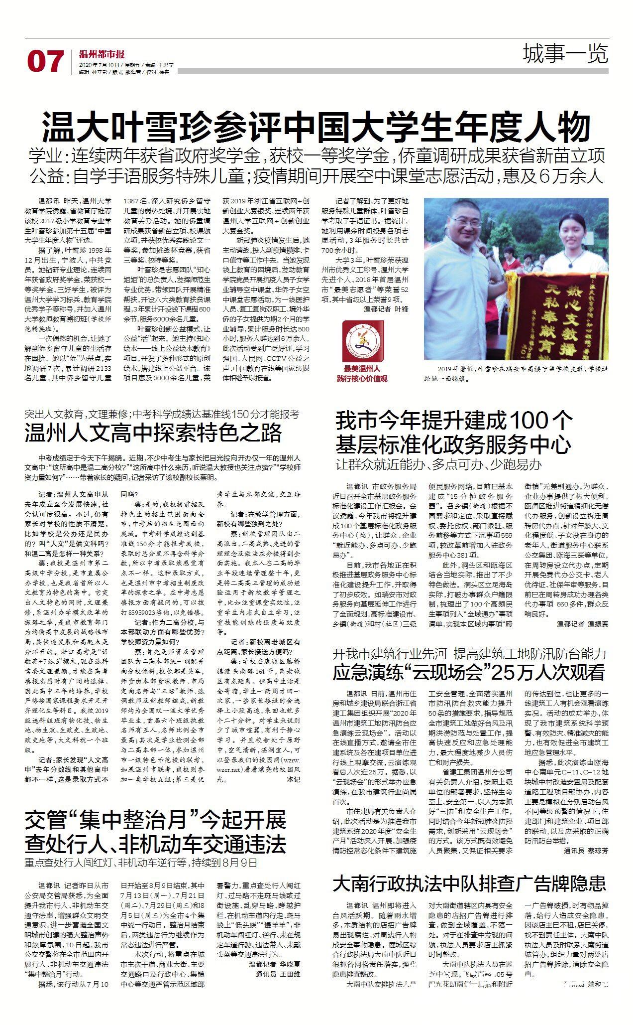 大学3年,叶雪珍荣获温州市优秀义工称号、香蕉视频 先进个人、2018年首届温州市“最美志愿者”等荣誉52项,其中省级以上荣誉9项。