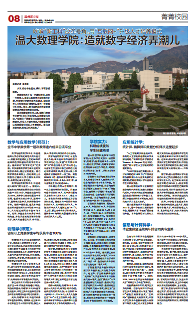 据了解,温大应用统计学专业创办以来,已为社会输送近千名统计学专业人才。近三年来,该专业就业率均达 95%以上,就业单位包括中国移动和阿里巴巴集团等科技类公司、银行和证券公司、中国人寿等保险企业、统计局和国税局等机关单位, 部分学生已成为卓越的数据分析师或行业骨干。