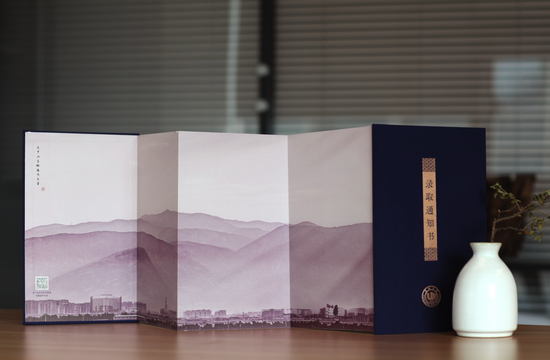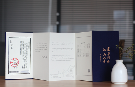在香蕉视频 本科招生录取现场,一本本蓝色烫金的录取通知书正整整齐齐得摆放在会议桌上,整装待发。通知书整体采用中国传统文书褶子样式,封面是烫金的“录取通知书”和学校校徽,封底是王蒙题词的校训“求学问是,敢为人先”。展开五折折页,正面分别是瑞安市东源村木活字传承人亲手印刷的录取证书页、校长寄语、校歌,背面则是以温州地理标志大罗山为底、温大建筑为前景的山水画卷。