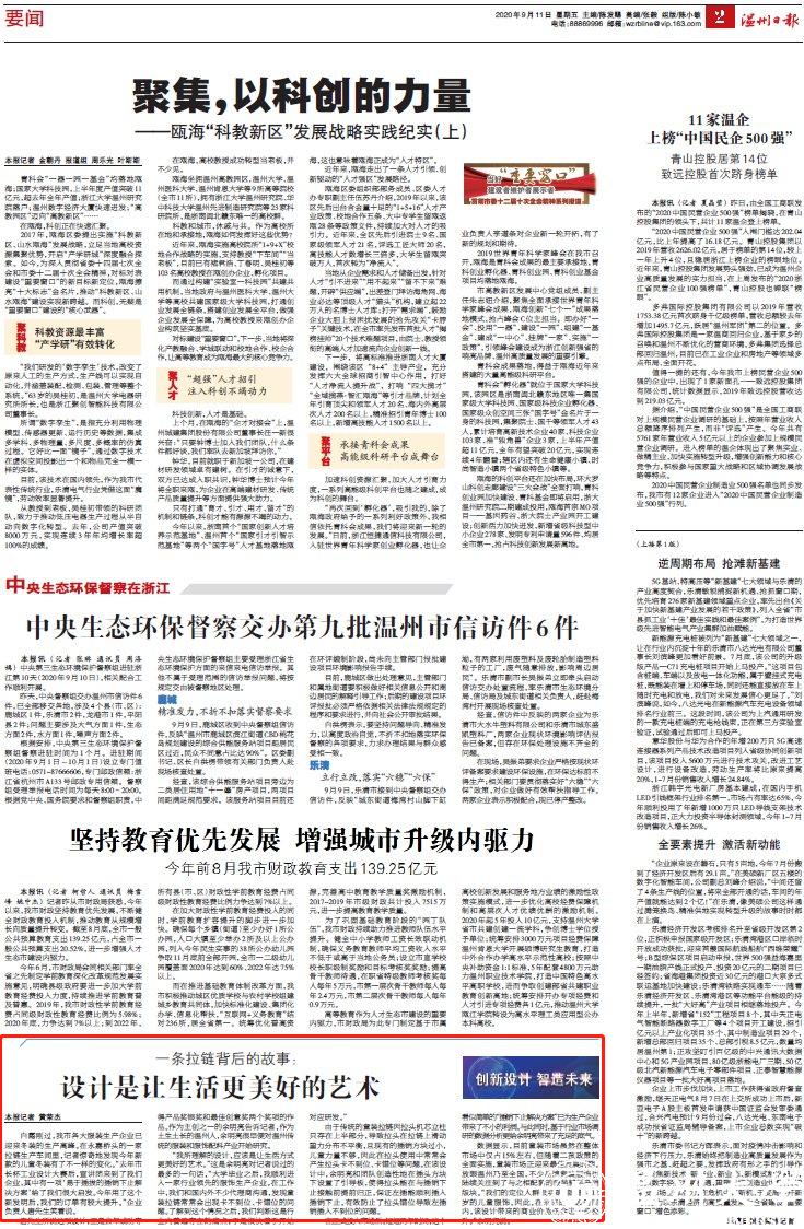 “我所理解的设计,应该是让生活方式更美好的艺术。”这是余明亮对记者说过的最多的一句话,“大学毕业之后,我顺利进入一家行业领先的服饰生产企业。在工作中,我们和国内外不少代理商沟通,发现童装拉链常常会出现卡不到位、卡错位的问题。了解到这个情况之后,我们判断这是行业内普遍存在的痛点,于是很快着手开始对应研发。”