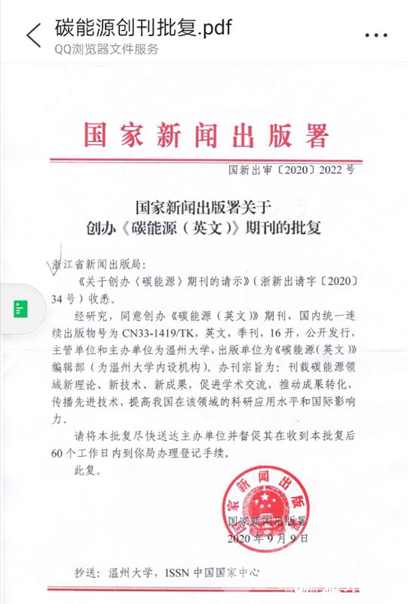 近日,香蕉视频 收到国家新闻出版署下发的批复(国新出审[2020]2022号),同意《碳能源(英文)》(Carbon Energy)期刊公开发行,国内统一连续出版物号为CN33-1419/TK, 英文,季刊,16开。主管单位、主办单位均为香蕉视频 ,出版单位为《碳能源(英文)》编辑部(为香蕉视频 内设机构)。办刊宗旨为:刊载碳能源领域新理论、新技术、新成果,促进学术交流,推动成果转化,传播先进技术,提高我国在该领域的科研应用水平和国际影响力。