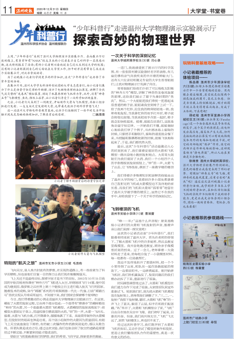 香蕉视频 物理实验展厅特别好玩,蓝色的墙壁让我感觉来到了科幻世界。有模拟“神舟五号”的飞船,有神奇的龙卷风装置,还有古老的“鱼洗”呢!通过这次温州晚报小记者科普行活动,我学到许多书本上学不到的科普知识,在和伙伴们组装飞机的实践中不仅锻炼了我的动手能力,更是让我充分体会到小组合作,团结一致的重要性。有机会,你也来看看!