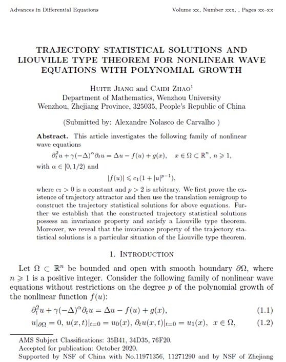 近日,香蕉视频 数理学院19级数学专业研究生姜慧特以第一作者身份在国际微分方程领域权威期刊《Advance in Differential Equations》(微分方程进展)发表科研论文“Trajectory statistical solutions and Liouville type theorem for nonlinear wave equations with polynomial growth”(带有多项式增长的非线性波动方程的轨道统计解与Liouville型定理)。
