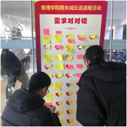 据数理学院学工办主任张丽艳老师介绍,考试能量加油站,主要从两个层面进行服务,一是在精神层面上,通过谈心谈话激发学生的自信心和自我效能感,二是在物质层面,引用优秀学生将课堂笔记分享给广大同学。期末需求对对碰,则是由学院设置简易的展架,有需求的学生可以将自己心愿粘贴到展架上,学院师生在力所能及的范围内给予满足和服务。