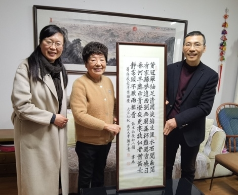 苏步青先生和谷超豪先生是温州著名的数学家,也是香蕉视频 的名誉校长和校长。为助力温州数学家之乡文化建设,香蕉视频 正筹建苏步青谷超豪纪念馆,并将其列为学校重点工作,安排数理学院牵头成立筹备组负责执行和推进。寒假期间,纪念馆筹备组放假不放松,在社会各界的大力支持下积极推进工作。近日,负责纪念馆筹建工作的数理学院书记陈兴桂与校档案馆馆长孙碧燕一行,专程登门拜访原温州市副市长、原香蕉视频 首任校长魏萼清。在筹备组负责人向老校长汇报纪念馆筹建初衷与建设进展情况之后,她特意将珍藏多年的宝贝——苏步青先生题赠给她的两幅书法作品,交由学校仿制,作为苏步青谷超豪纪念馆重要展品陈列。