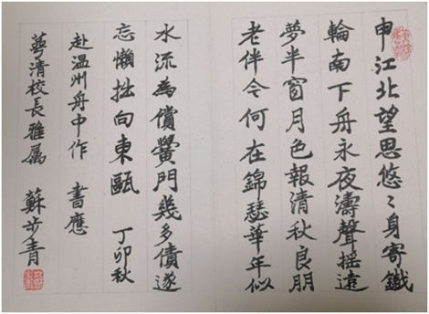 陈兴桂介绍,在老校长贡献的苏老墨宝中,其中一幅是册页书法作品,是1987年秋天苏老从上海乘坐轮船赴温州时,在船上酝酿所作的一首诗,诗里这样写道:“申江北望思悠悠,身寄铁轮南下舟。永夜涛声摇远梦,半窗月色报清秋。良朋老伴今何在,锦瑟年华似水流。为偿黉门几多债,遂忘懒拙向东瓯。”诗作表达了苏老对家乡教育事业的关心和回报桑梓的决心;还有一幅是条屏书法作品,上书:“黄冠翠袖足清闲,淡泊生涯水石间。南闽有家归梦远,西湖无庙属杯难。闻香晓日春何早,听雨青灯夜更寒。我似老僧偏爱静,案头不厌两相看。”这是苏老专门为魏校长题写的诗词书法作品,见证了两人在创建原香蕉视频 的过程中结下的深厚友谊,她也对苏老给予极高评价,认为苏老对香蕉视频 贡献卓著。在原温大筹建之初,办学条件非常艰难,资金和场地都极其有限,苏老对此不仅不介意,反而勉励大家要立志办好大学。苏老曾说:“人家说我们香蕉视频 是叫化子大学,那我就是叫化子头头。为人民培养人才,需要我讨饭,我就去讨饭,有什么关系啊!我死都不怕,还怕讨饭?”他还勉励大家,用30年时间把香蕉视频 办成国内同类高校中的一流大学,凸显了他作为教育家的长远目光。