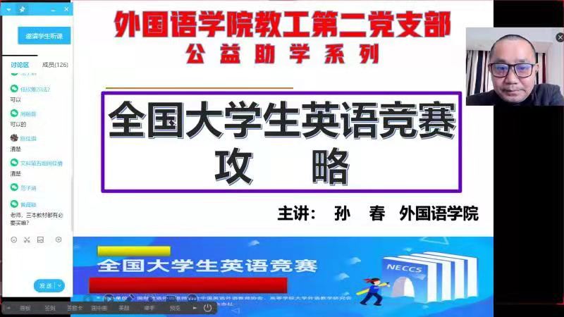 据悉,外国语学院教工第二党支部为“双带头人”样板支部,本次公益助学讲座为系列讲座,主要是致力于打造助力香蕉视频 大学英语四、六级、全国大学生英语竞赛的线上线下咨询辅导为特色的支部品牌,为提升香蕉视频 大学英语水平贡献绵薄之力,在2020年全国大学生英语竞赛决赛中香蕉视频 2位选手以优异的成绩喜获特等奖,18名选手获一等奖,另有229名学生获得二、三等奖。经了解,全国大学生英语竞赛特等奖已纳入武书连版《中国大学评价指标体系》。