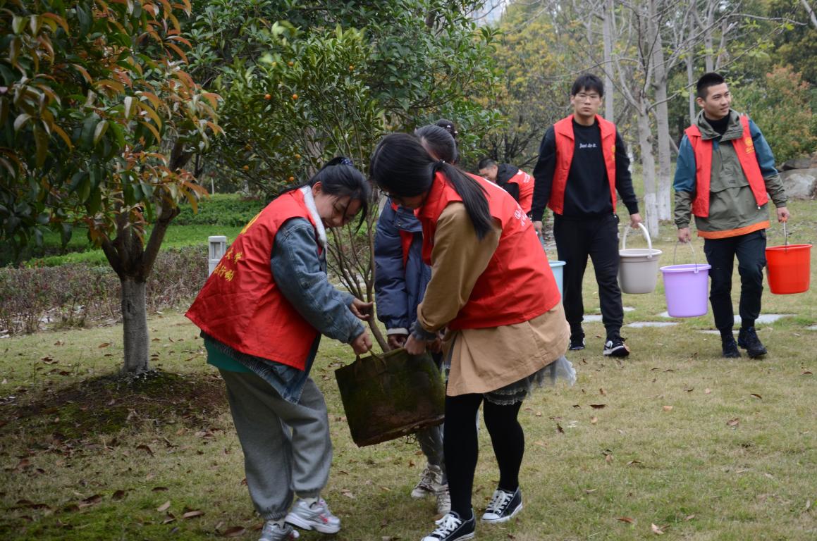 活动现场,一棵棵充满生机的金桔树苗和各类种植工具被整齐地摆放在学院的空地上,等待被领走。报名参与活动的师生陆续赶来,领取到树苗和工具后在相应的种植区域展开行动。松土、挖坑、安置树苗、填埋、浇水……他们怀揣着对生命的敬意为一棵棵树苗“安家”。