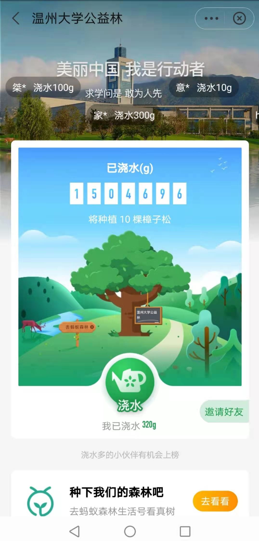 此外,生环学院的师生们还在网络上发起“云植树”的号召,依托支付宝的蚂蚁森林平台,鼓励全校师生为“香蕉视频 公益林”浇水,做建设美丽温大、美丽中国的践行者。