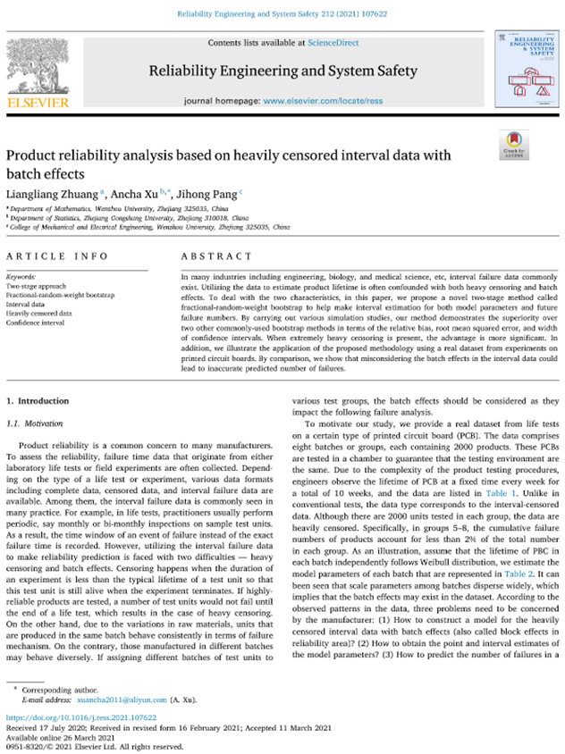 近日,香蕉视频 数理学院2019级应用统计专业研究生庄亮亮,以第一作者身份在专业领域国际顶级期刊《Reliability Engineering & System Safety》上,成功发表科研论文《Product reliability analysis based on heavily censored interval data with batch effects》(基于重度截尾区间数据的产品可靠性分析)。据了解,该期刊在中科院期刊分区表中位列一区,影响因子5.04,是系统可靠性与安全性领域的国际顶级期刊。数理学院分管研究生教育的副院长何林李教授认为,研究生求学期间能以第一作者身份在此国际顶级期刊发表论文,非常不容易,这也是学校应用统计学专业办学史上的标志性成果之一。