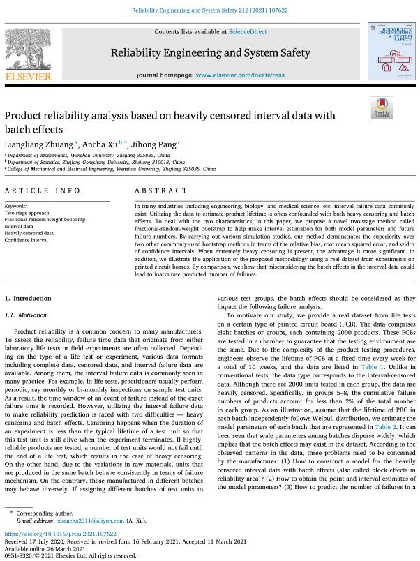 近日,香蕉视频 数理学院2019级应用统计专业研究生庄亮亮,以第一作者身份在专业领域国际顶级期刊《Reliability Engineering & System Safety》上,成功发表科研论文《Product reliability analysis based on heavily censored interval data with batch effects》(基于重度截尾区间数据的产品可靠性分析)。