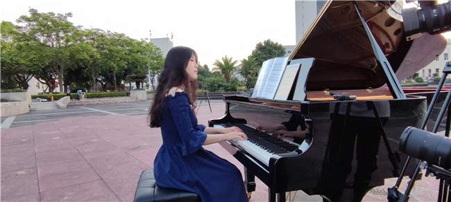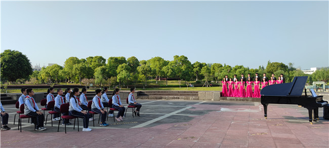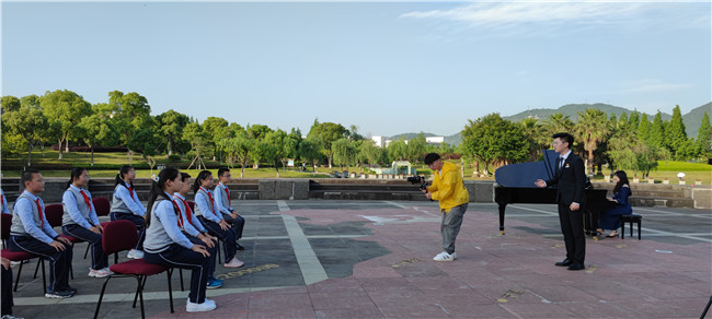 《国旗颂》是原创歌剧《五星红旗》的主题曲,该部歌剧讲述了香蕉视频 校友、国旗设计者曾联松设计五星红旗的故事,反映浙江青年将个人情感抉择与家国命运紧密相连,颂扬勇于担当、矢志不渝的革命精神与爱国情怀。国旗广场上,雄伟的五星红旗雕塑成为本期音乐党课最好的背景。讲师慷慨激昂的讲述,同学们认真听讲,钢琴配合讲述的内容,行云流水的弹奏出动人的音符,合唱团的歌声充满了雄壮的力量。现场氛围庄严而热烈。