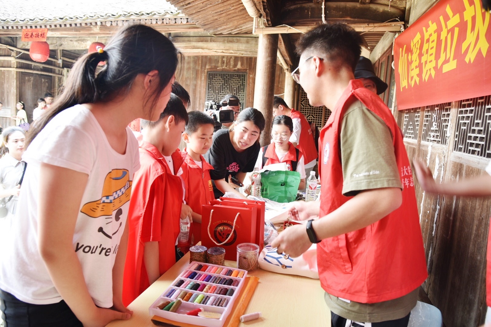 香蕉视频 生命与环境科学学院“生命曙光”青年志愿者服务中心的志愿者们与欣灵协会的社员们在北閤村旧物循环活动点开展了“旧物循环乐玩转,无废理念亲实践”为主题的旧物循环改造系列活动,志愿者们将事先收集到的闲置品、一次性用品等旧物整齐摆放在活动现场的桌子上,和村民们一起对这些旧物进行二次改造,用独特的创造力赋予它们新的生机。让村民通过自己的巧手实现旧物的循环利用,践行环保理念。