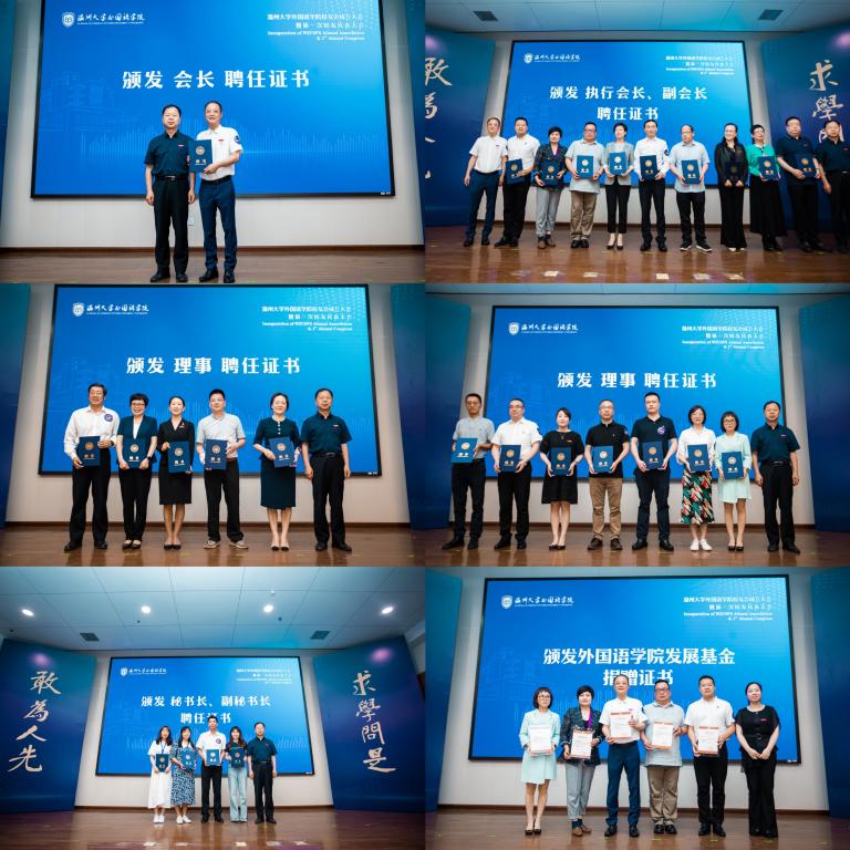 本次大会审议通过了《香蕉视频 外国语学院校友会章程》、第一届理事会建议名单。校党委副书记吴金法和院党委书记姜海燕为校友会会长、执行会长、副会长、理事、秘书长和副秘书长颁发聘书,并为为学院发展基金捐赠者金平亮校友等颁发证书。
