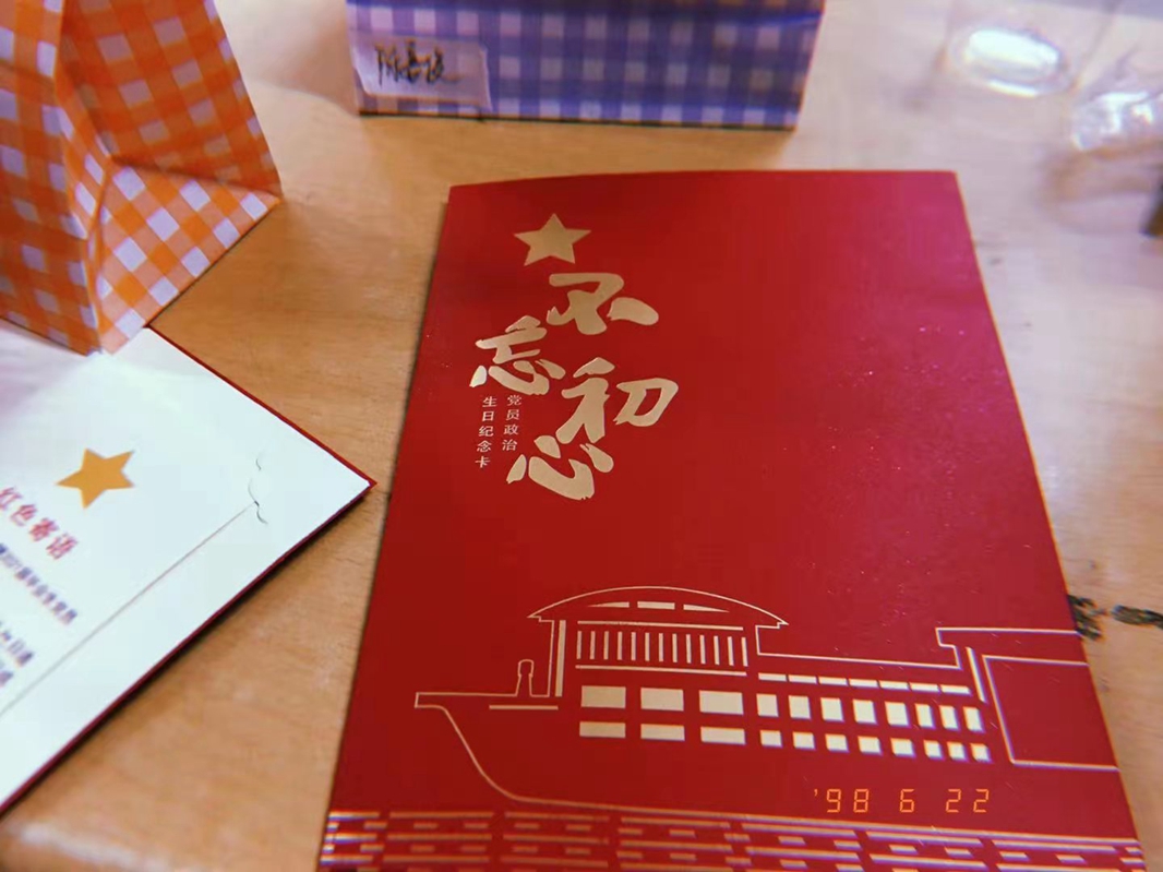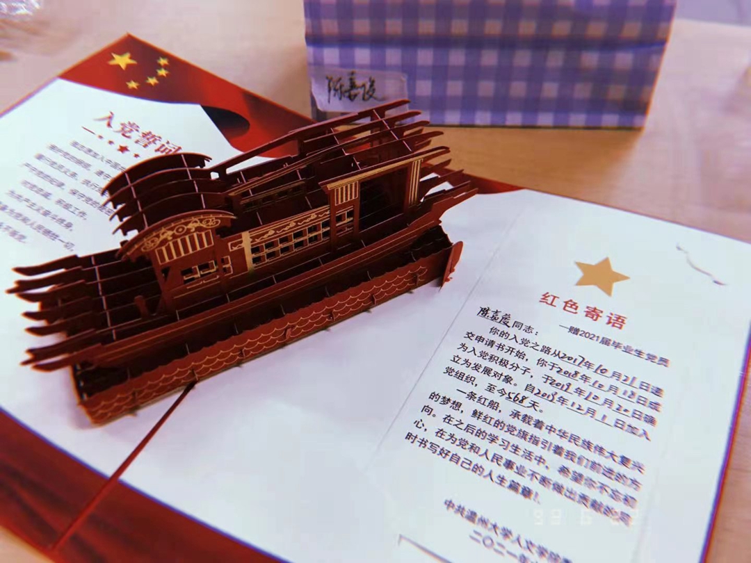 “这个纪念卡片很有意义,入党誓词、立体纸塑红船,还有入党历程。”