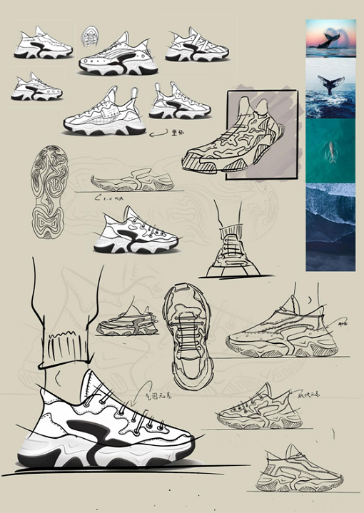 在本次项目研发中,团队专项针对“鲸鱼2.0”进行了长达半年多的研究与鞋履设计。作为一个年轻的团队,由一批青年教师、研究生及本科生组成的成员,在项目前期针对鞋底研发进行多次头脑风暴,从鲸鱼主题入手,挖掘故事,提取鱼尾、鱼腹、海浪、波纹、礁石等元素进行草图设计。根据品牌提出的鲸鱼仿生设计要求,IP延续保留鲸鱼鱼尾在鞋底侧墙的造型,鞋底则采用轻软弹科技材料及时尚老爹鞋厚底风格,侧墙视觉锤鱼尾则在1代基础上做了升级,使得整体作品更具层次感和时尚感。