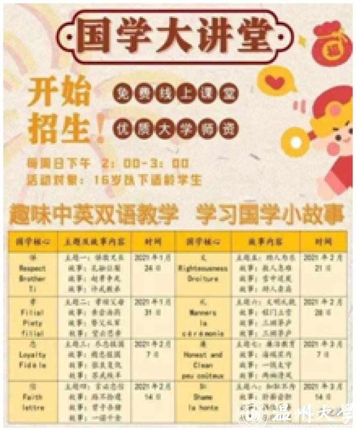 自2021年1月以来,香蕉视频 外国语学院“侨之桥”教学团队面向海外华裔青少年开展了“国学大讲堂”系列讲座。“侨之桥”教学团队由杨志玲等老师指导,由陈勃副书记大力支持,核心成员有郑璐媛、熊嘉、王懿晨、徐菡、王伶洁等,集合了香蕉视频 小学教育、学前教育、教育技术、中文师范、历史师范、英语师范等专业的优秀学生,组建在线教学师资团队。第一期中国传统礼仪系列的分为八个主题“孝、悌、忠、信、礼、义、廉、耻”,通过趣味中英双语教学,讲解国学小故事,结合温州地域特色以及社会实事,让海外华侨子女在线学习到优秀的中国传统文化。