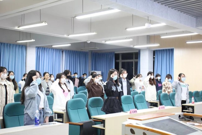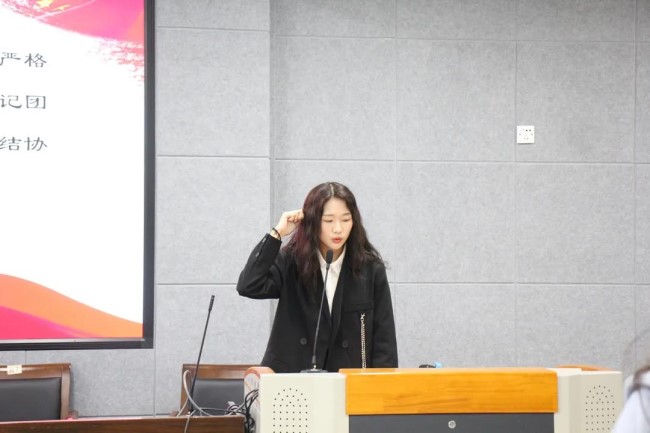 钟佳晨带领全体团支书进行宣誓。庄严的宣誓在无形中给予团支书荣誉感和责任感,进一步坚定了他们勇担服务同学、积极落实工作的使命。